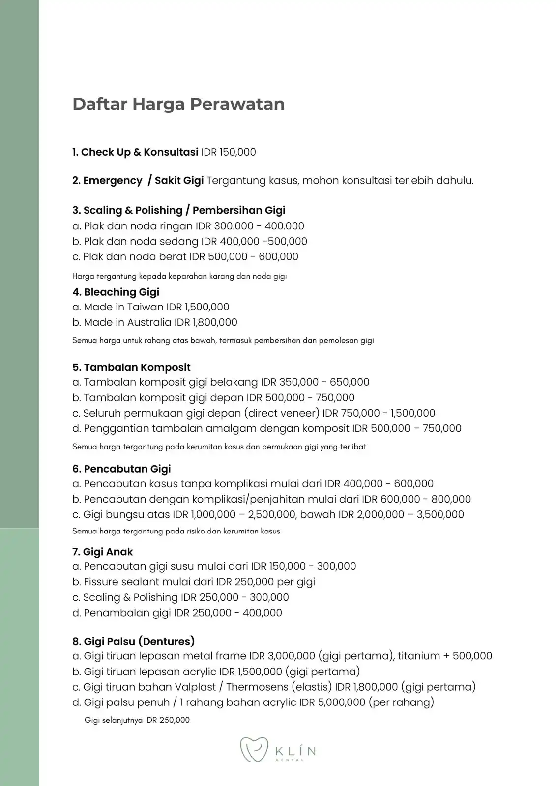KLÍN Dental melayani basic dentistry (konsultasi, pembersihan karang gigi, tambal gigi, cabut gigi) dan juga aesthetic dentistry (bleaching gigi, veneer gigi, crown gigi, & pembuatan gigi palsu semua jenis). KLÍN Dental menggunakan sistem reservasi / janji dalam setiap perawatan pasien, sehingga pasien dapat mengetahui perkiraan harga sebelum datang ke klinik, dan tidak perlu menunggu lama.